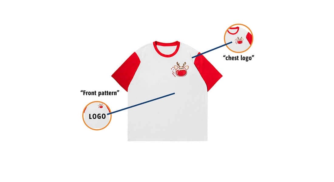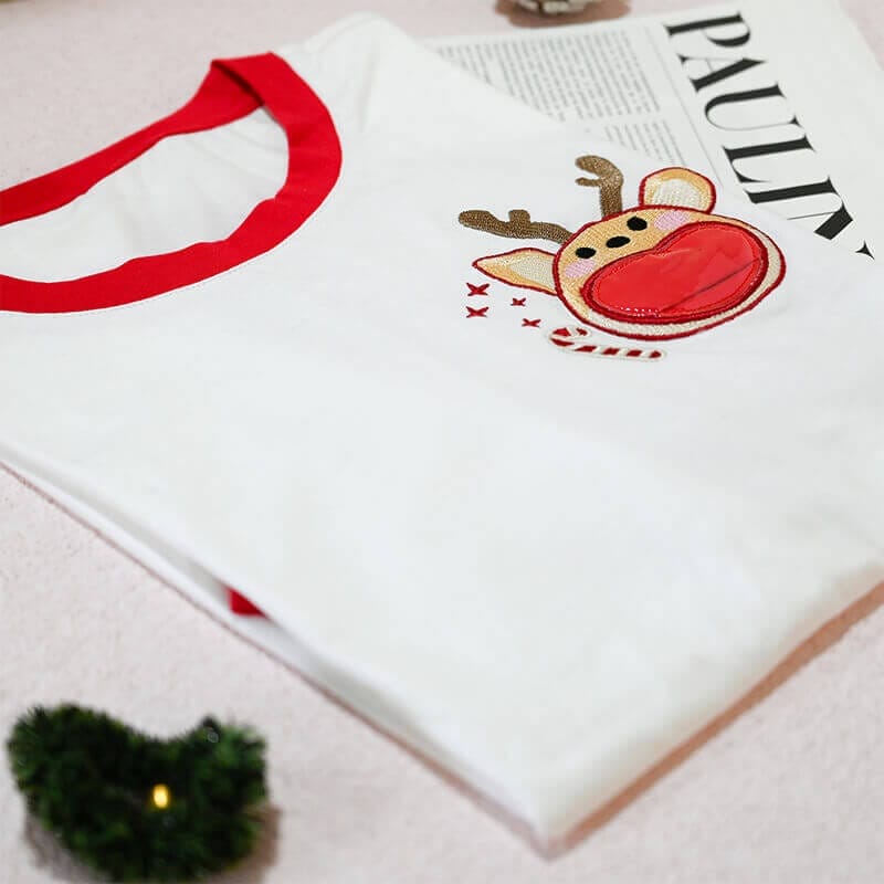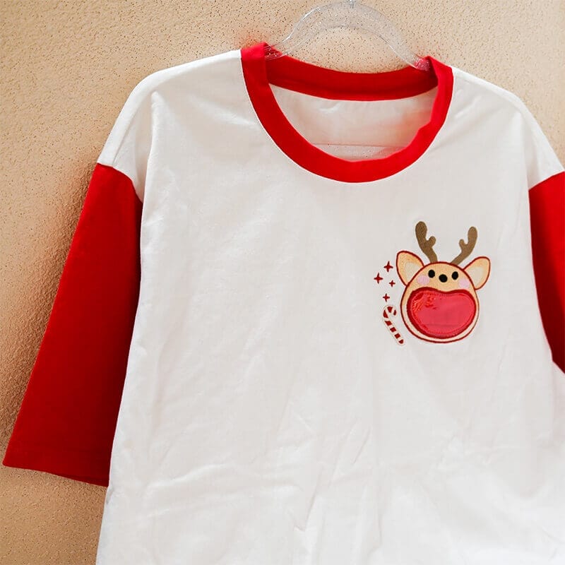 Custom Red White Raglan T-Shirt Cute Reindeer Embroidery Soft Comfortable Fabric Stylish Crew Neck Design